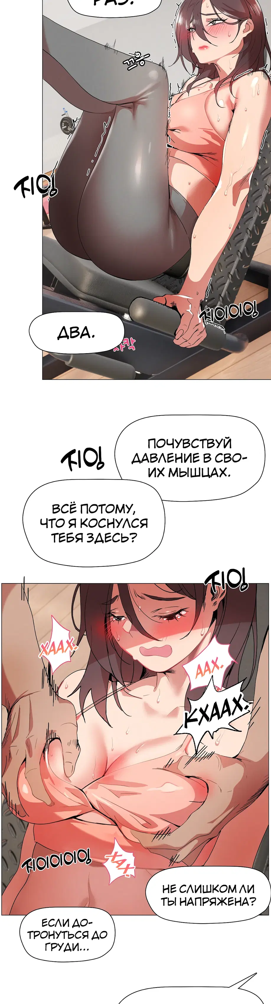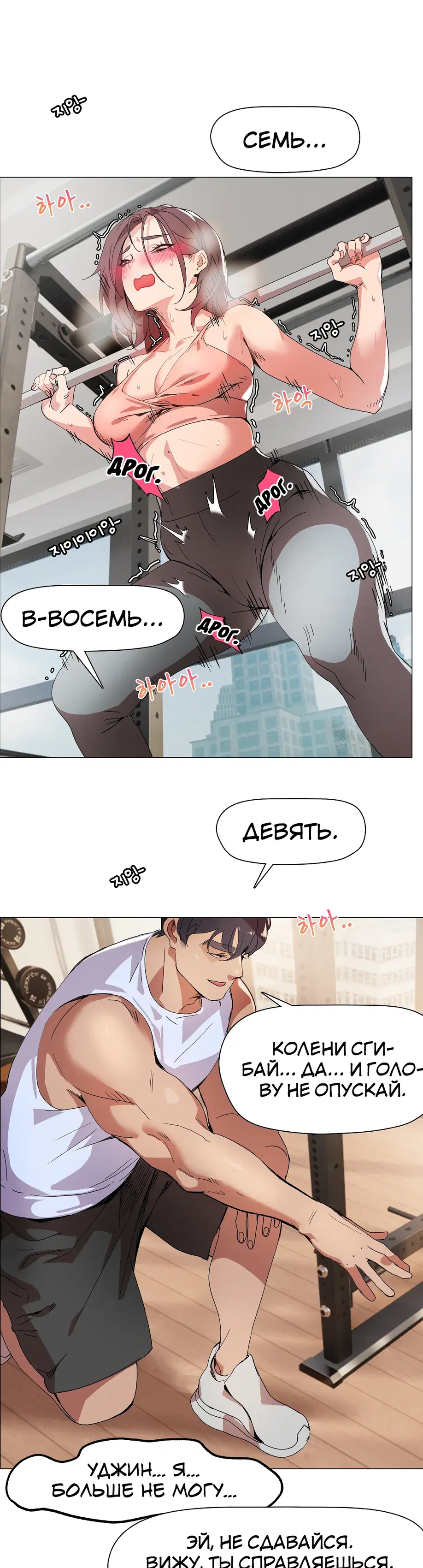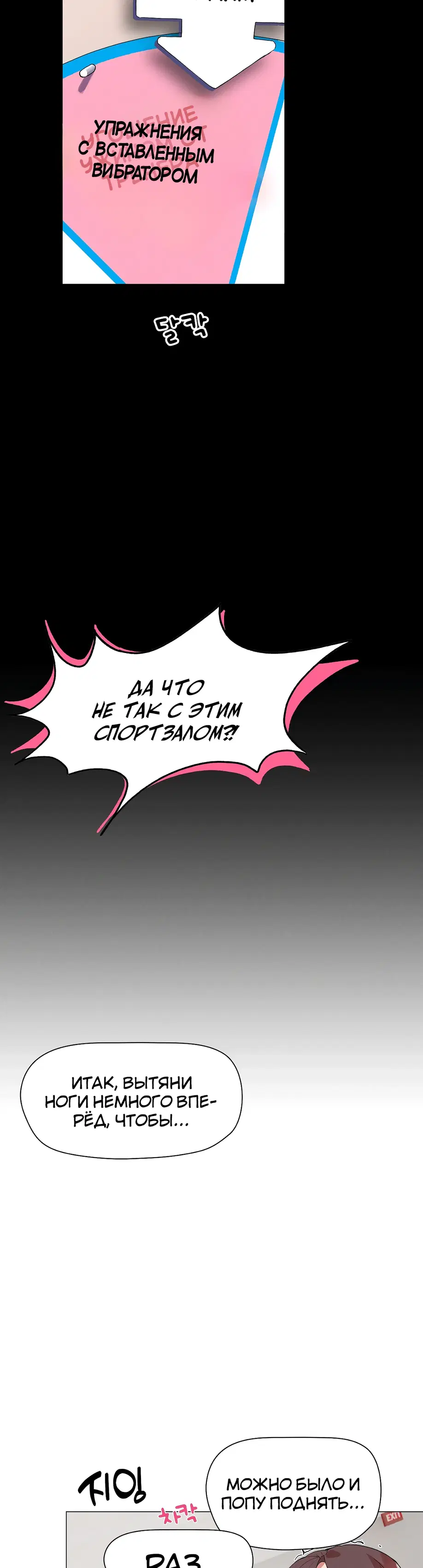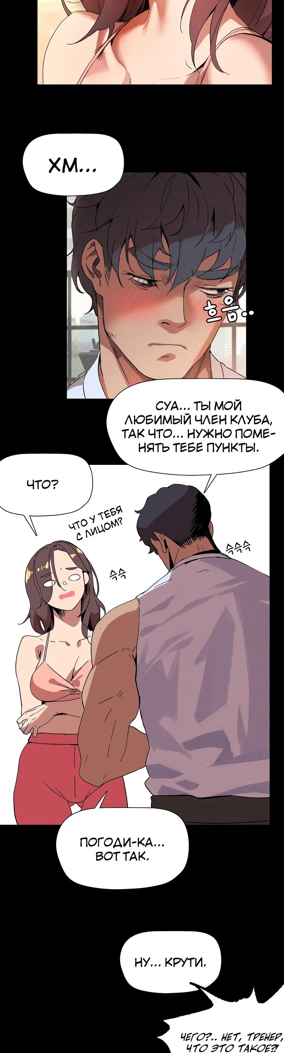 Подруга советует Суа посещать занятия по фитнесу 1:1, и она усердно старается выучить упражнения, но бутылка с водой учителя постоянно касается ее нижней части тела. «Сэр, не могли бы вы... убрать эту бутылку с водой?»«Бутылку с водой?»«...Там... там... там что-то твердое застряло между... Я думаю, там застряло что-то твердое...»«А... это... Это не ведро...»