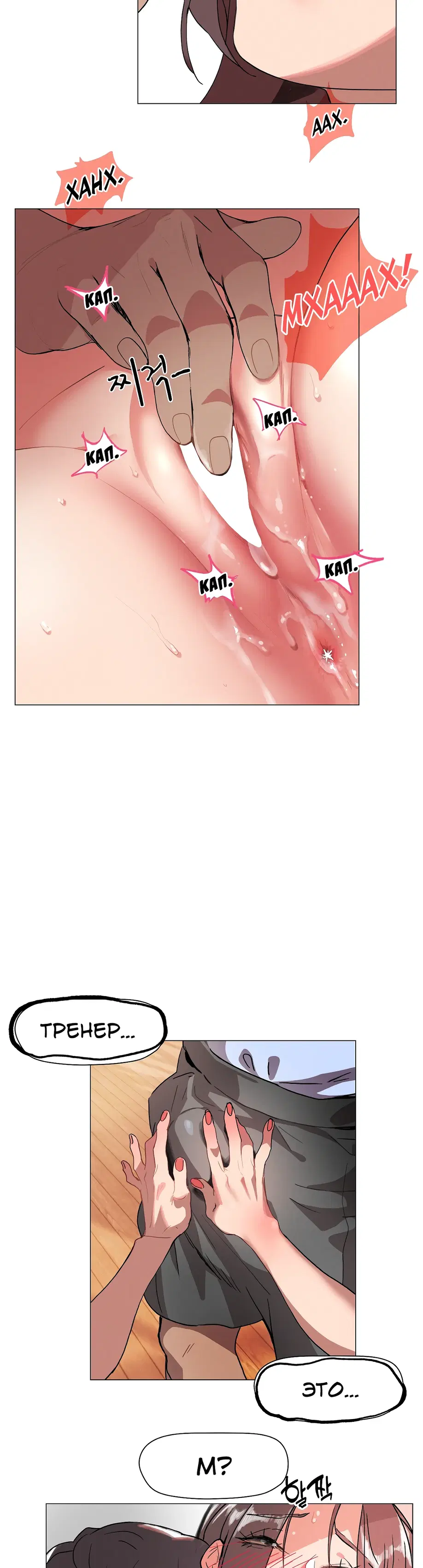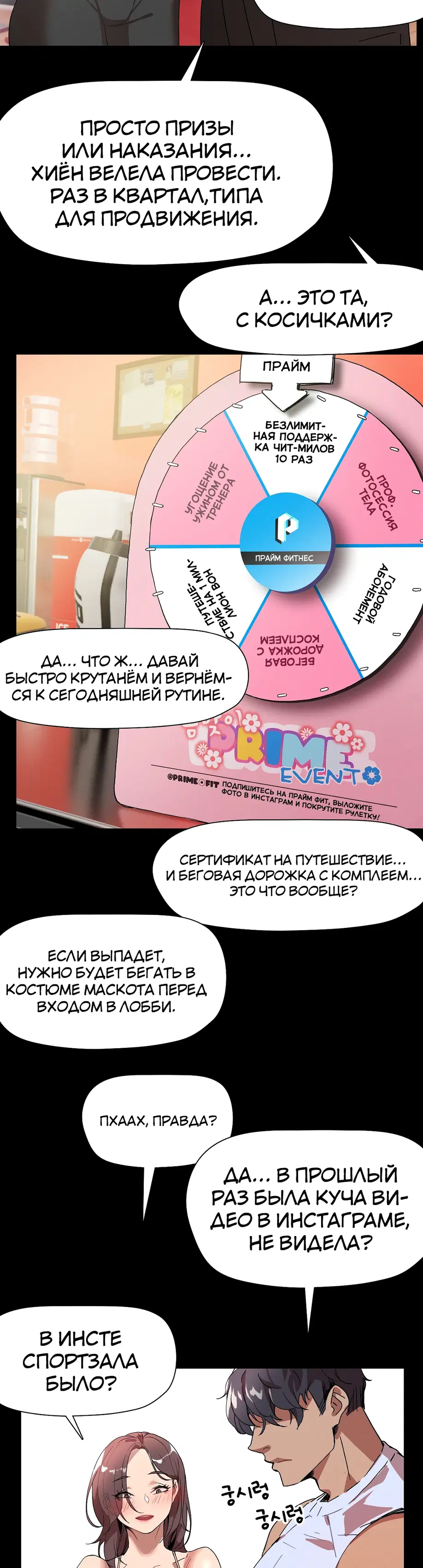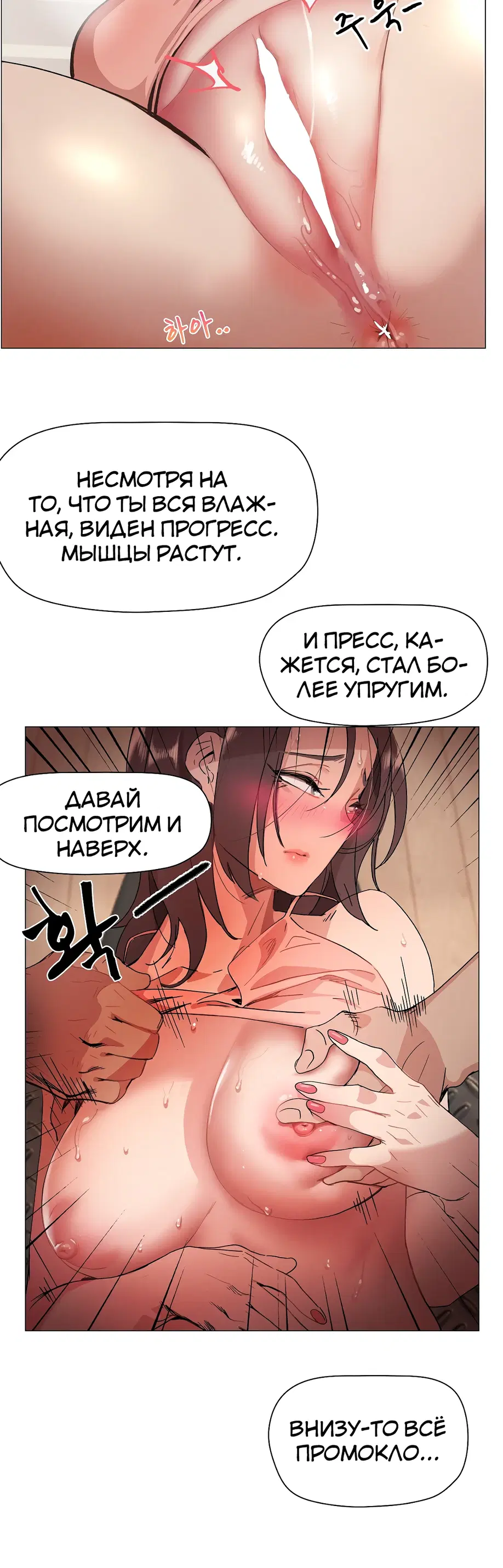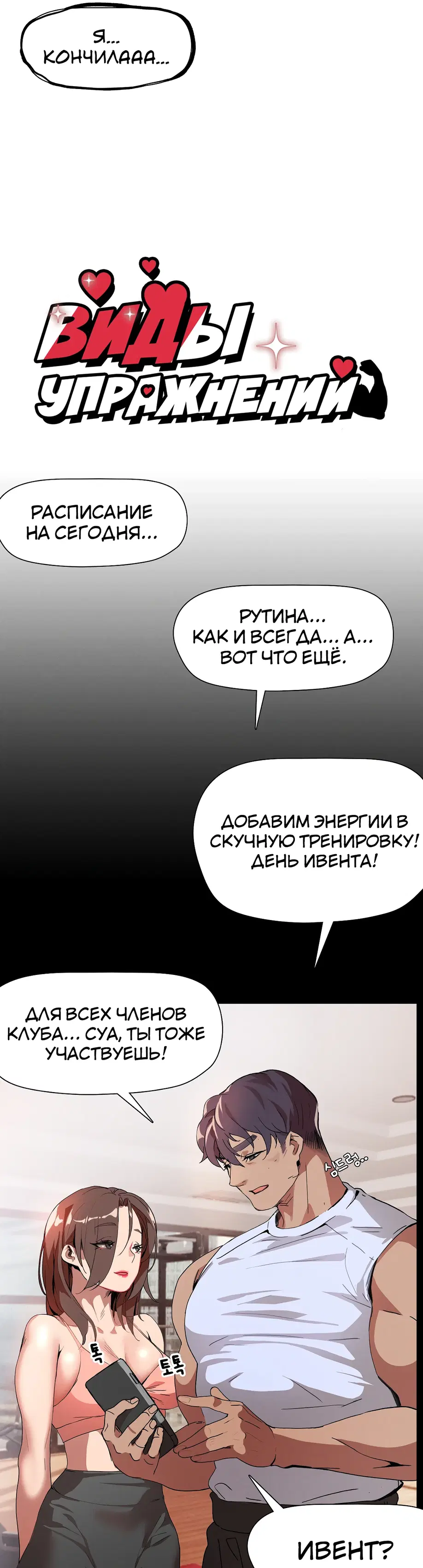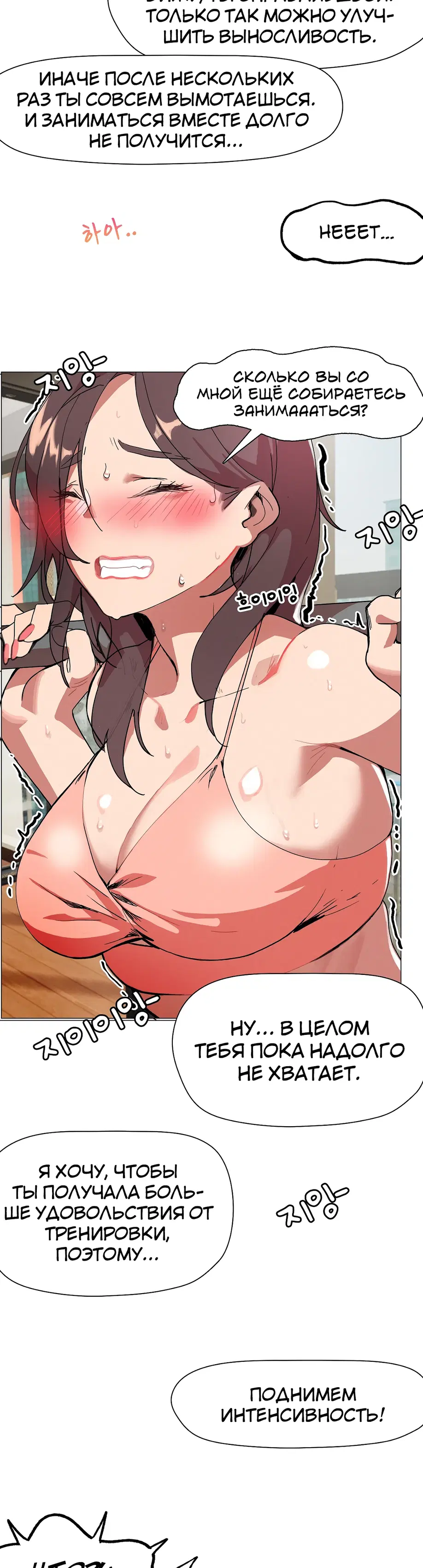 Подруга советует Суа посещать занятия по фитнесу 1:1, и она усердно старается выучить упражнения, но бутылка с водой учителя постоянно касается ее нижней части тела. «Сэр, не могли бы вы... убрать эту бутылку с водой?»«Бутылку с водой?»«...Там... там... там что-то твердое застряло между... Я думаю, там застряло что-то твердое...»«А... это... Это не ведро...»